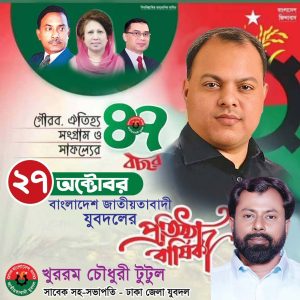২৭ অক্টোবর, বাংলাদেশের জাতীয়তাবাদী যুবদলের ৪৭তম প্রতিষ্ঠাবার্ষিকী উপলক্ষে ধামরাইয়ে উদযাপনের আমেজ ছড়িয়ে পড়েছে।